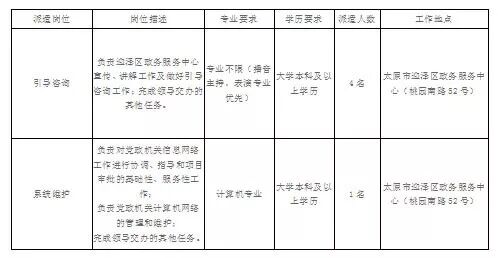根据工作需要,现面向社会招聘4名引导咨询,1名系统维护工作人员,由太原青创人力资源有限公司派遣至太原市迎泽区政务服务中心工作。
